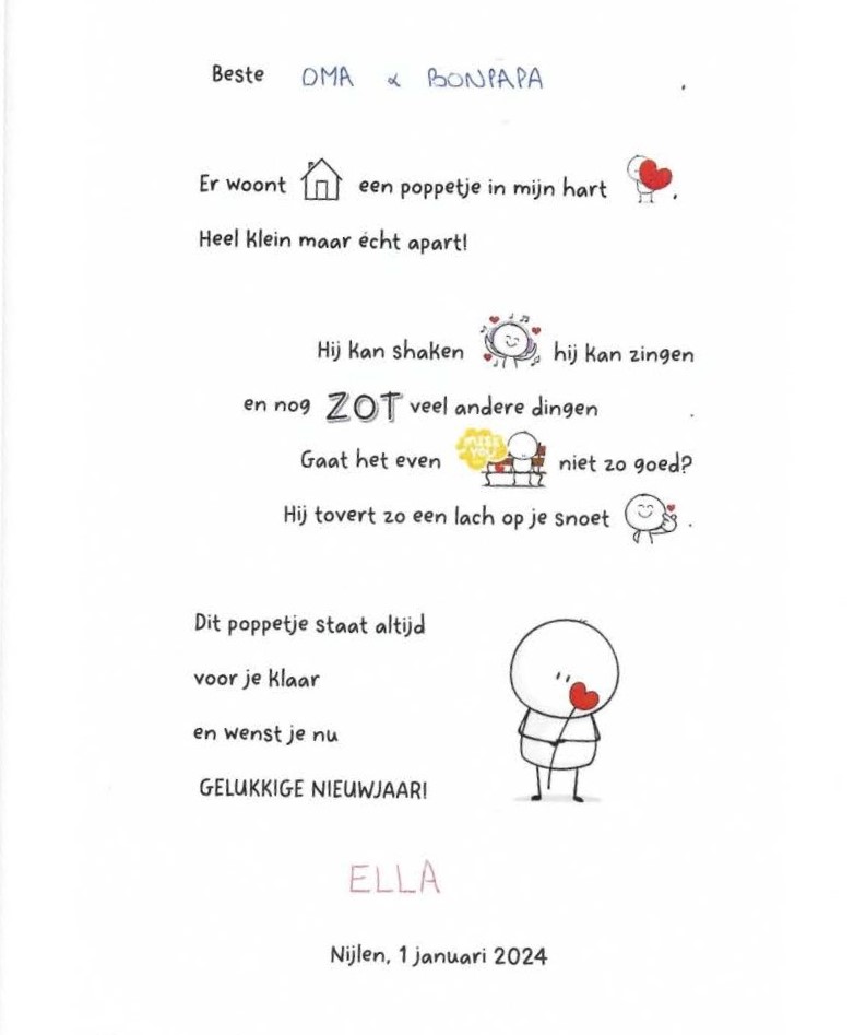 Nieuwjaarsbrief van Ella (voorzijde) – Nijlen, 1 januari 2024.